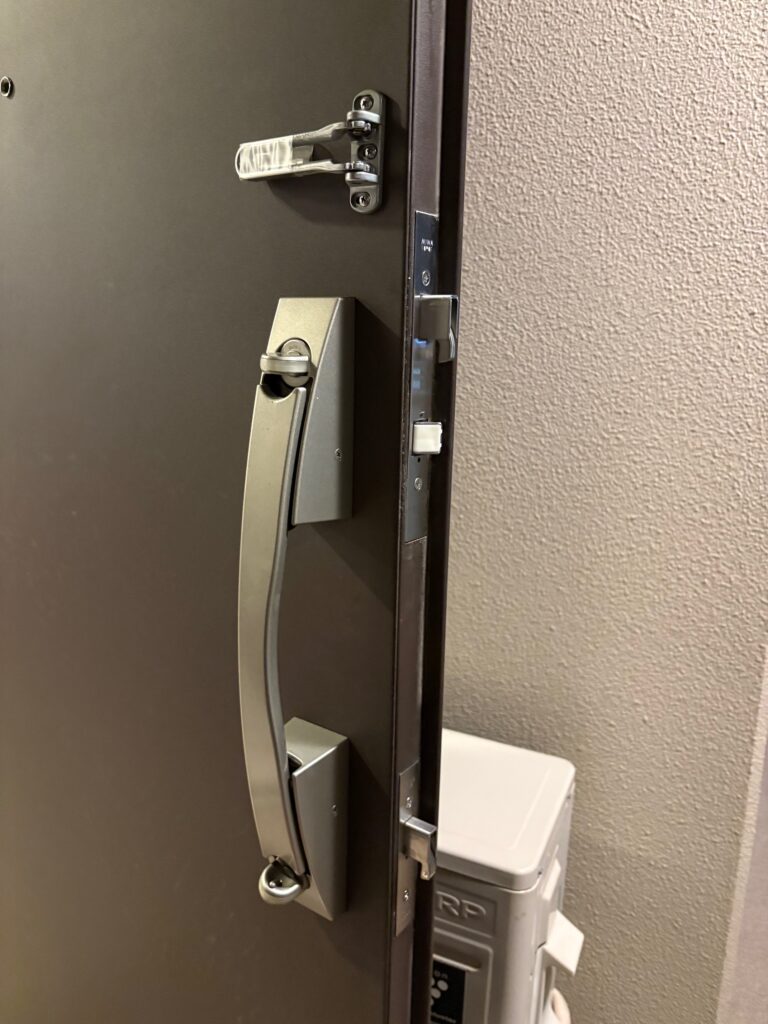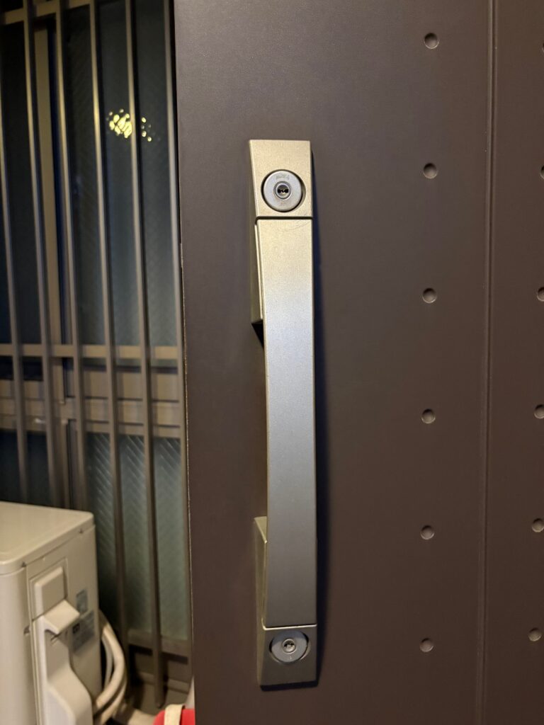 早速お伺いし、確認すると、上側のサムターンのボタンが取れてはいるが、回せる状態です。しかしめちゃめちゃ重たいです。表からもキーで回すと重たいです・・・